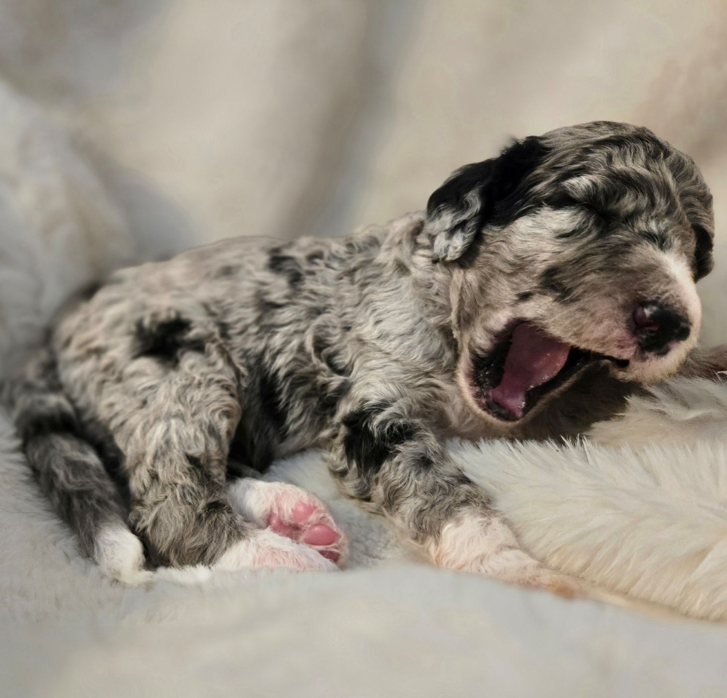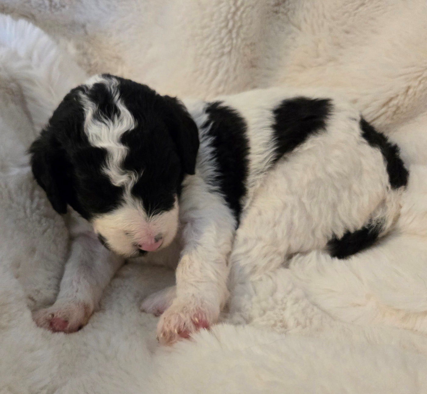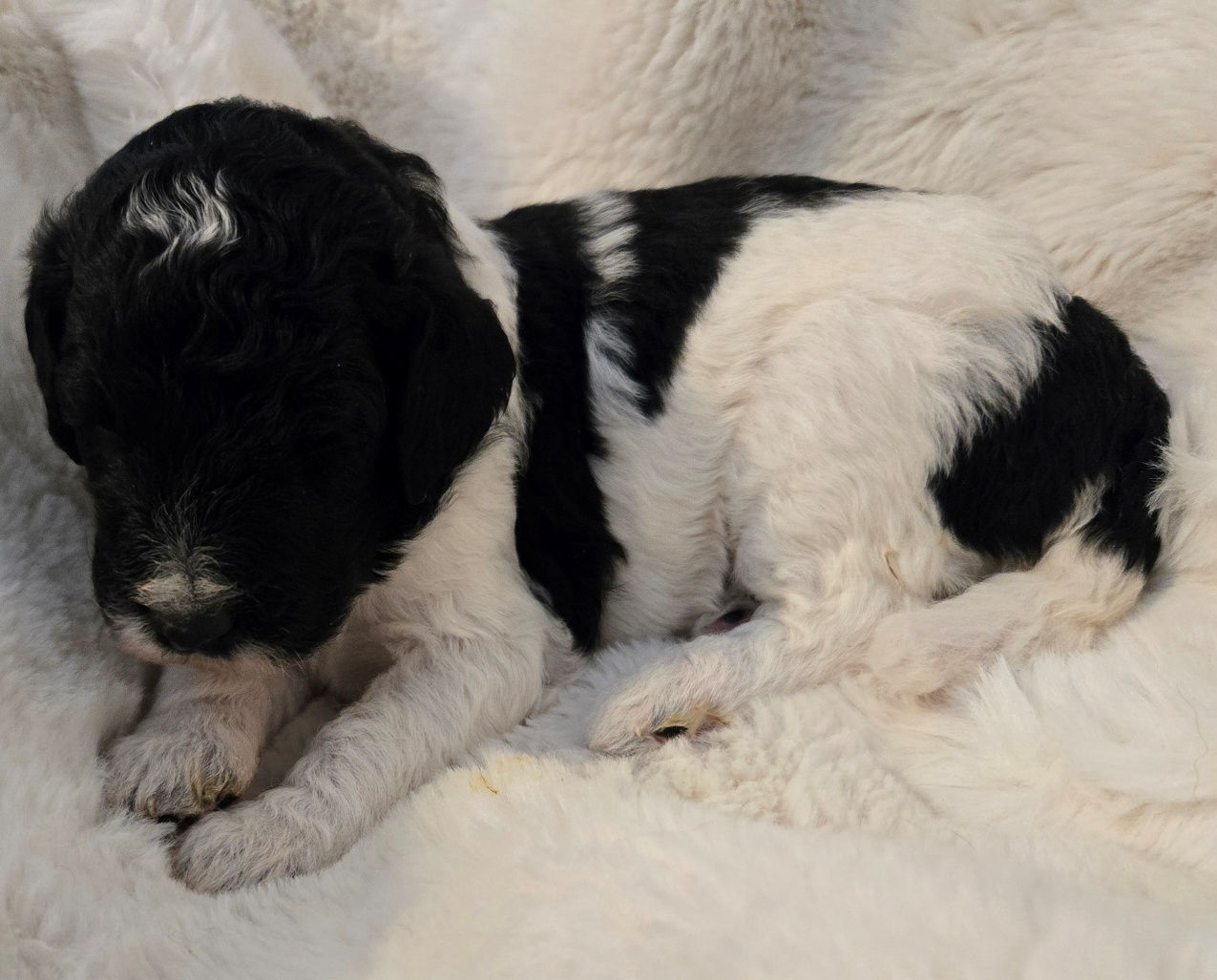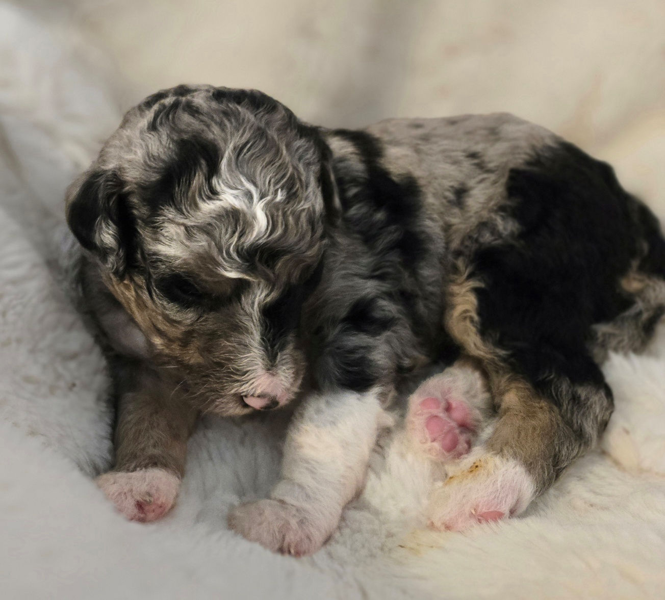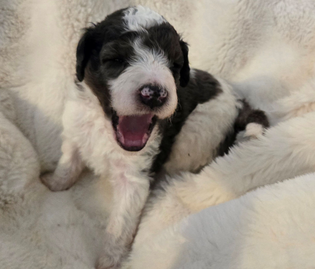 We are happy to announce that Rowe gave birth to 7 beautiful babies on March 17, 2026. Puppies will be going home late spring/early summer. There are 5 boys and 2 girls in this litter, see below details about each puppy. This litter will be medium to standard size (45-65 pounds full grown). These puppies are a cross between Labradoodle x Bernedoodle, producing a dog that has a wonderful love of life, they are playful, loving, loyal, highly intelligent and trainable, and have the intuitive nature that Doodles are know for to excel at service dogs, therapy dogs, and family pets. Please call 303-847-2369 or Email: contact for additional information, or would like to be added to the wait list. Note: All puppies are sold on a spay/neuter contract.